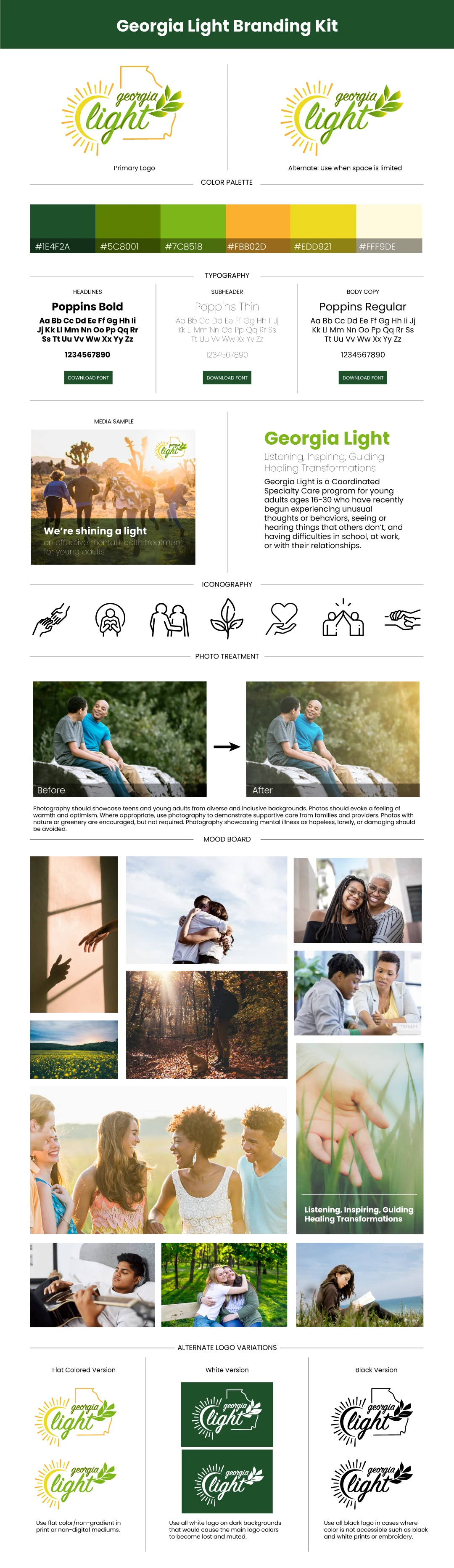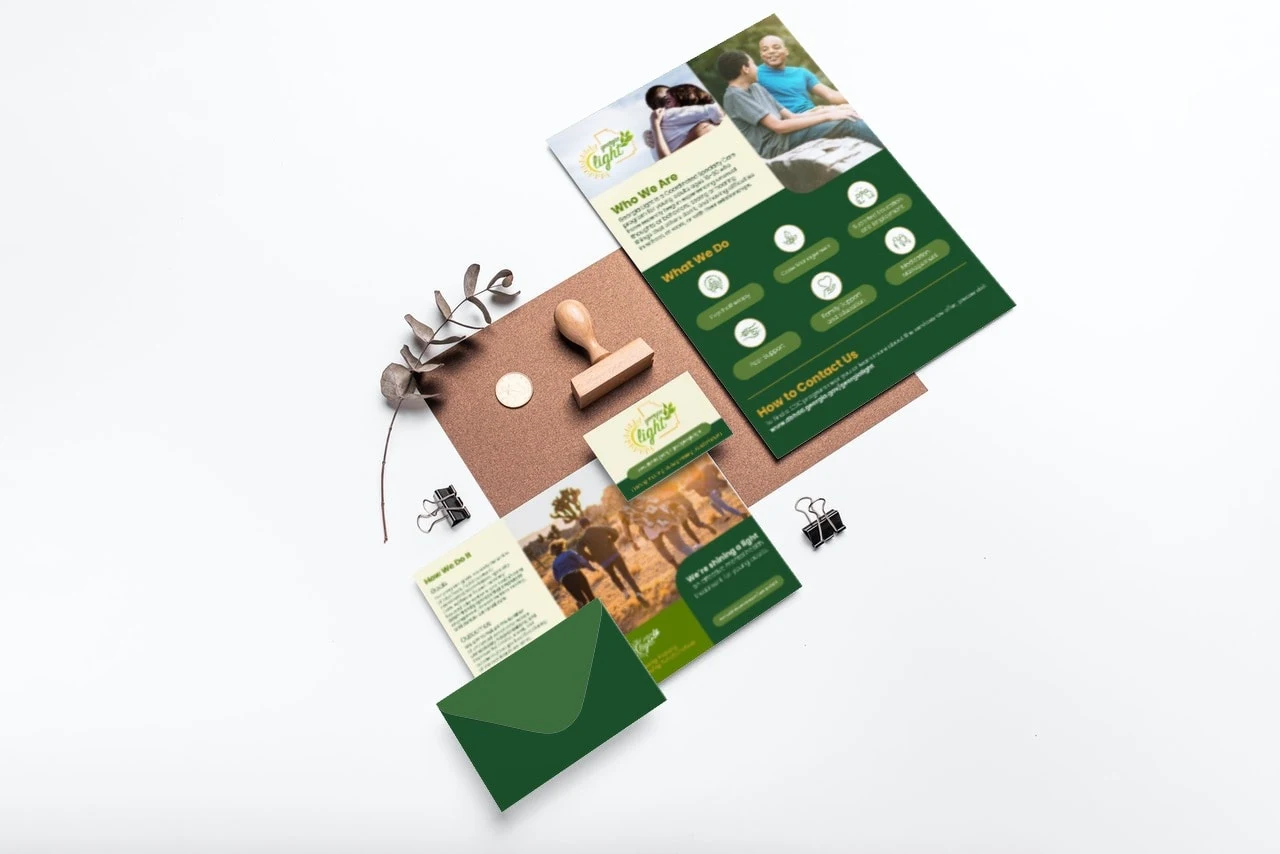 This branding kit was developed for Georgia Light, a mental health organization. The client asked for a branding toolkit and website that can easily be reused and edited by those with little to no background in design.